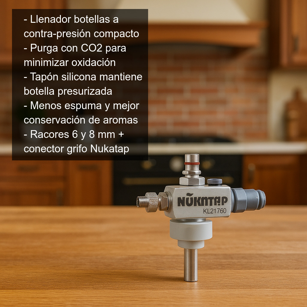 Llenador de botellas compacto, versátil y económico, ideal para el embotellado de cerveza casera (o cerveza de barril) con la mínima oxidación posible. Este llenador a contra-presión está diseñado para ayudarte a conseguir un envasado más limpio, con menos espuma y con una mejor conservación de aromas y sabor, especialmente en cervezas lupuladas o delicadas.