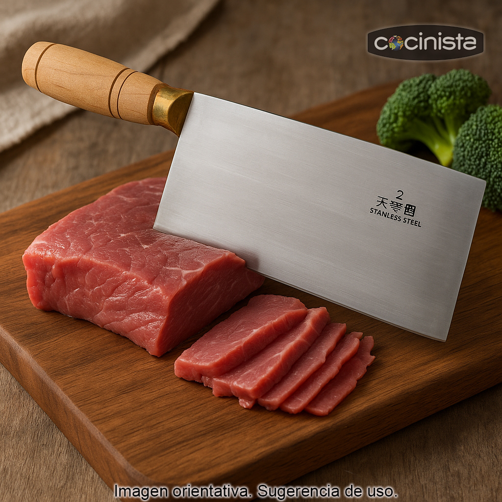 Inspirada en el uso tradicional de los cocineros chinos, esta macheta es extremadamente versátil: permite filetear, cortar en juliana, picar y preparar carnes y verduras con gran eficiencia. Su formato ancho facilita además recoger y trasladar ingredientes desde la tabla hasta la sartén o el wok.