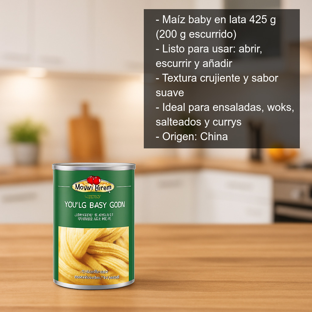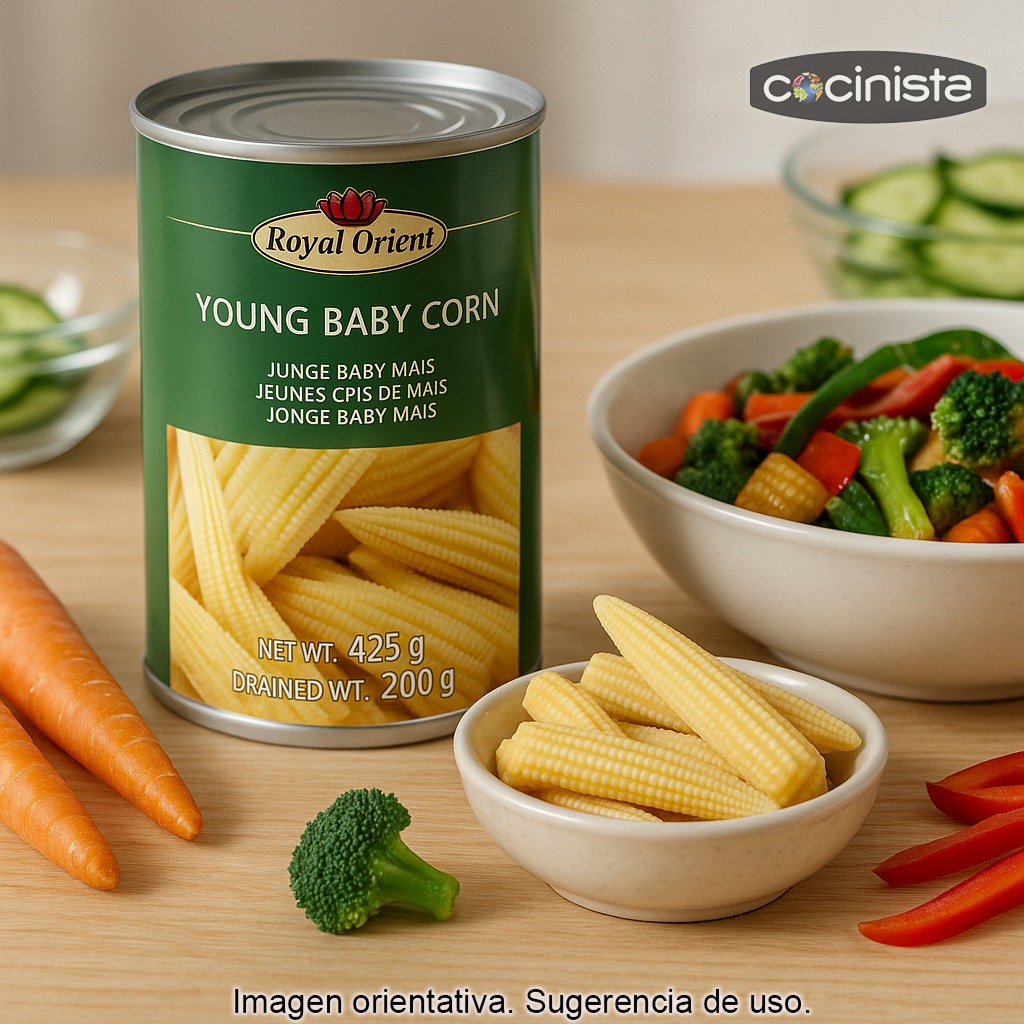 El maíz baby, también conocido como mini mazorca, se recolecta antes de que el grano madure. Por eso mantiene una textura crujiente y un sabor suave que combina muy bien con verduras, carnes, mariscos, tofu, salsas especiadas o agridulces y aderezos cítricos. Es un ingrediente muy utilizado en la cocina asiática (especialmente en platos tipo wok, curry o salteados), pero también funciona de maravilla en preparaciones occidentales cuando buscas aportar color, contraste y un toque original.