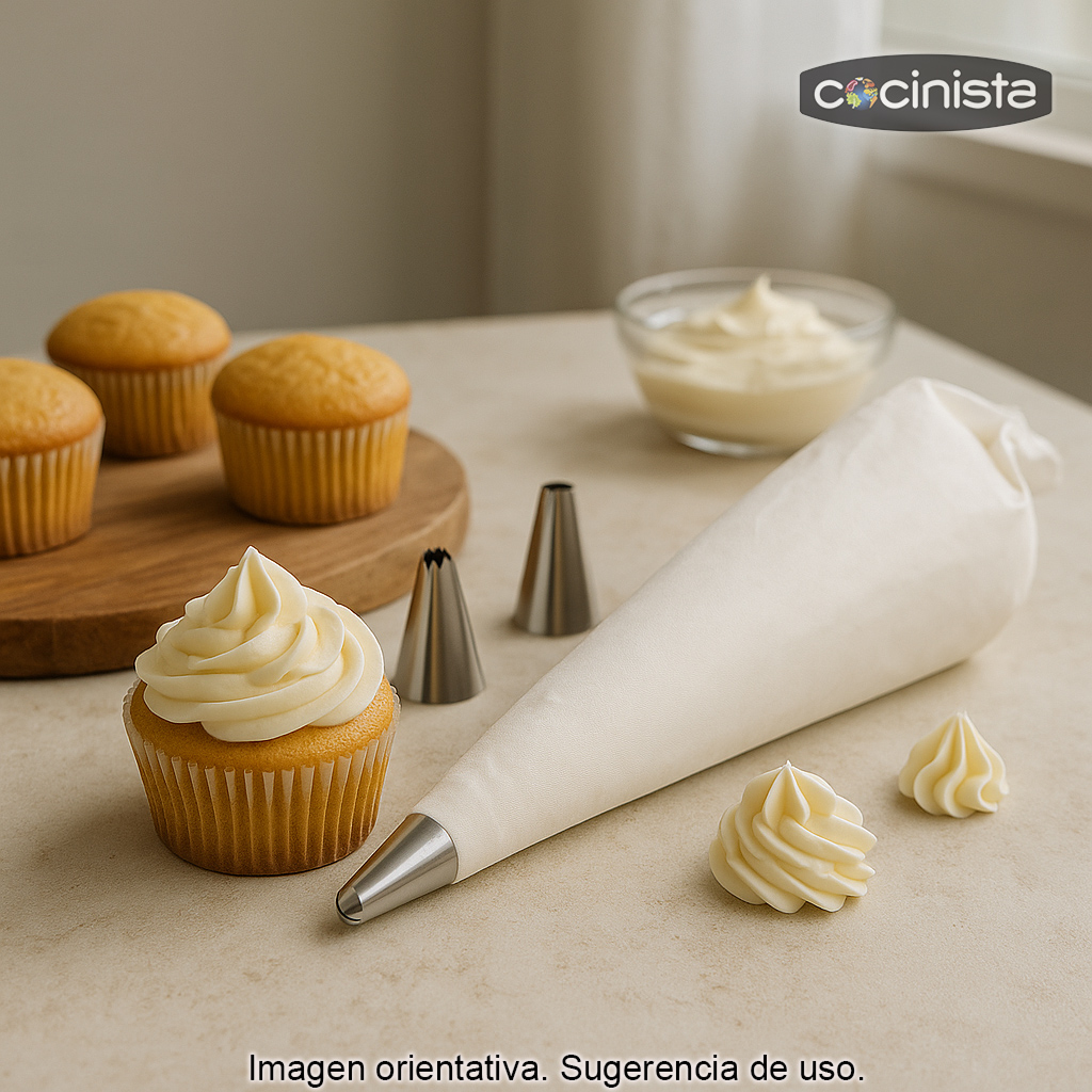 Con este set de manga pastelera de 30 cm con juego de 4 boquillas Lacor podrás decorar y rellenar con mayor precisión todo tipo de elaboraciones, desde repostería clásica hasta presentaciones saladas. Es un conjunto pensado para ofrecer durabilidad, buen agarre y resultados limpios, ideal tanto para principiantes como para aficionados que buscan una herramienta fiable en su cocina.