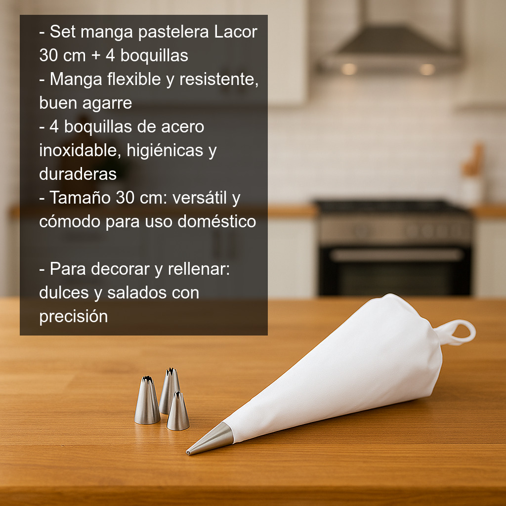 Si buscas una manga pastelera con boquillas para mejorar tus decoraciones y dar un toque profesional a tus recetas, este set de manga + 4 boquillas Lacor es una opción práctica, resistente y muy completa para el día a día.