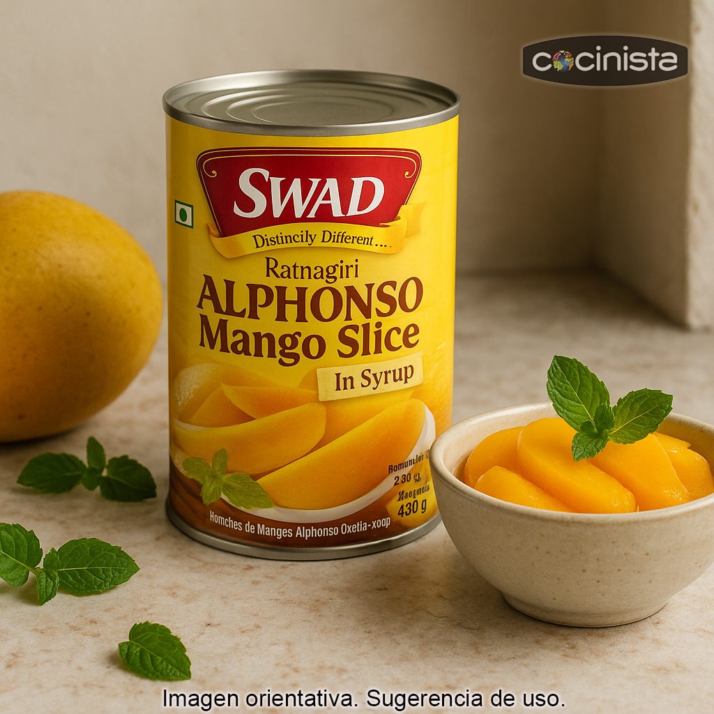 - Presentación: trozos de mango en almíbar.