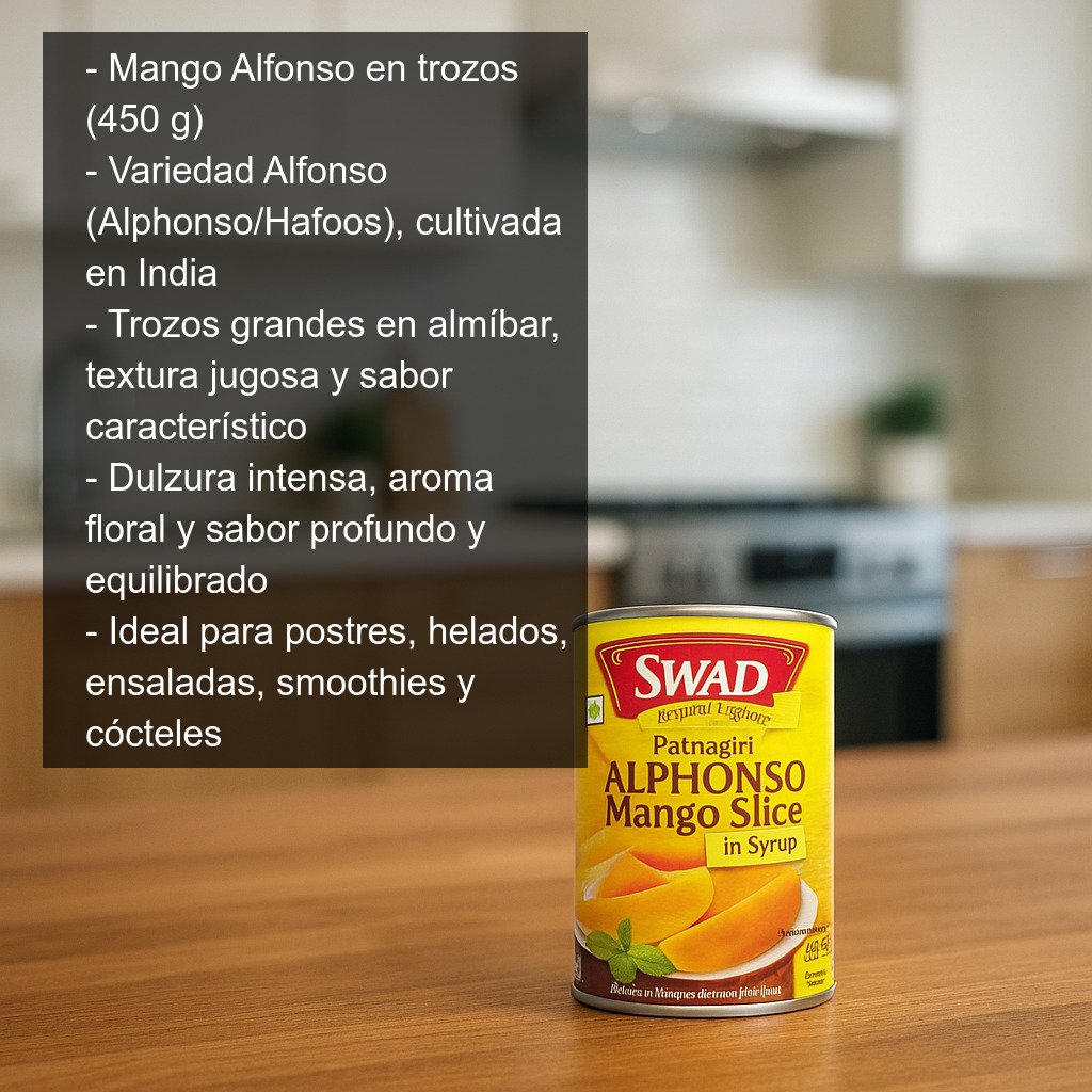 Mango Alfonso en trozos (450 g) de la prestigiosa variedad Alfonso (o Alphonso), también conocida como Hafoos, cultivada desde hace siglos en la India. Este mango es considerado por muchos como uno de los más apreciados del mundo por su dulzura intensa, su aroma floral y su sabor profundo y equilibrado, motivo por el que a menudo se le llama el “Rey de los Mangos”.
