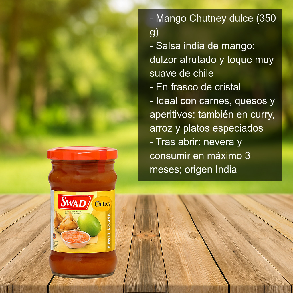 El Mango Chutney dulce (350 g) es una deliciosa salsa india elaborada a base de mango, con un equilibrio perfecto entre dulzor afrutado y un toque muy suave de picante gracias al chile. Este chutney de mango se presenta en frasco de cristal y es ideal para dar un punto exótico y aromático a tus platos, tanto en cocina india como en recetas del día a día.
