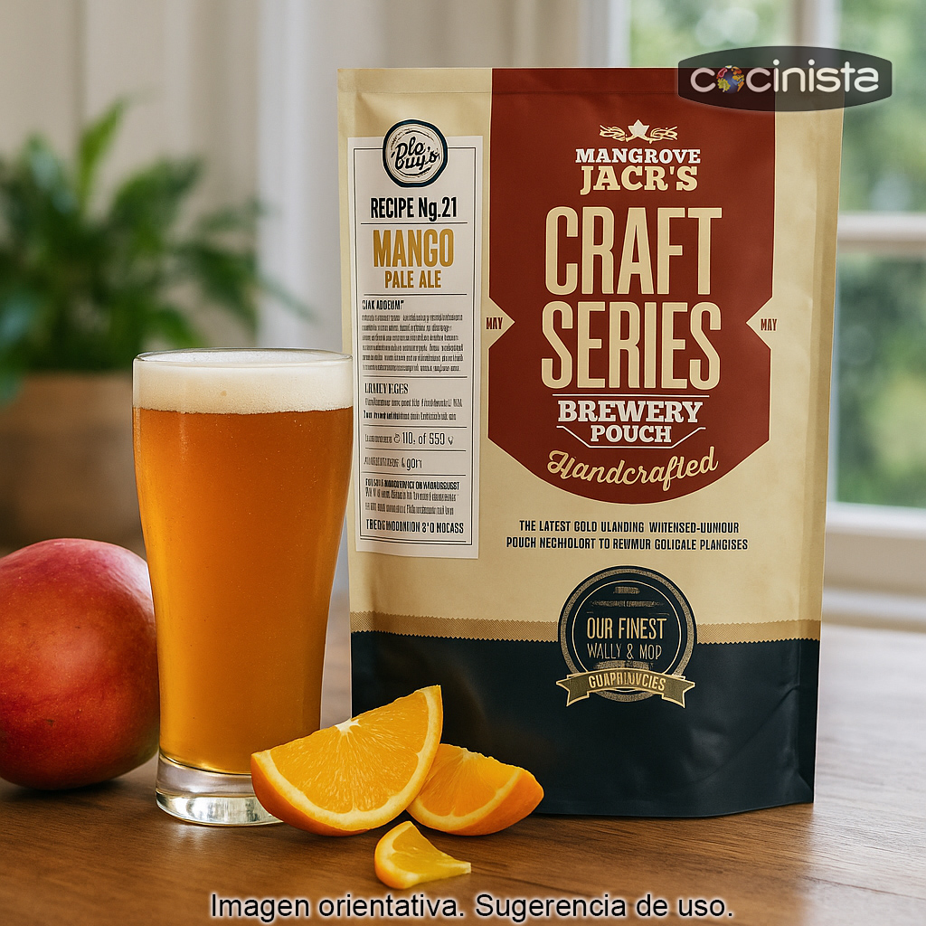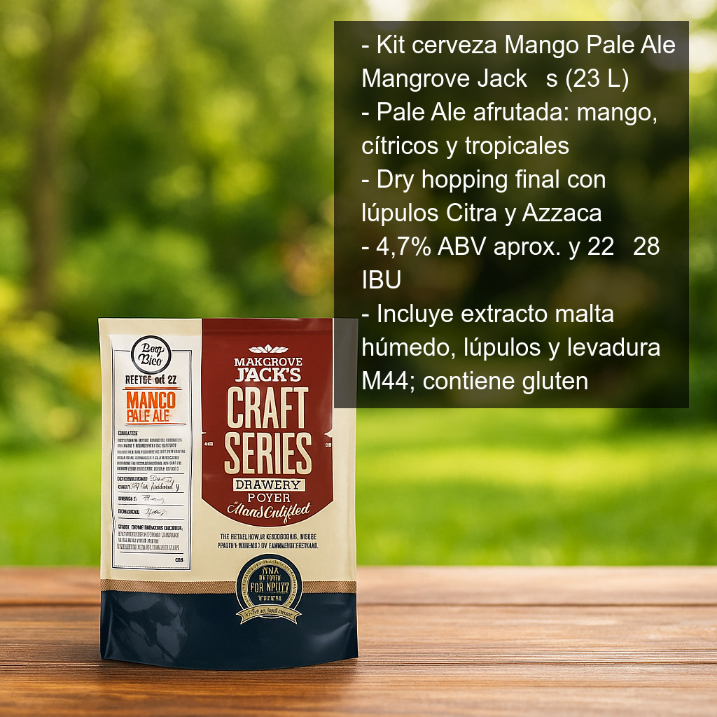 El kit de cerveza Mango Pale Ale (23 litros) de Mangrove Jack’s es una opción ideal para elaborar en casa una cerveza artesanal tipo Pale Ale afrutada, con un perfil muy aromático gracias al extracto de zumo de mango y un dry hopping final con lúpulos seleccionados. El resultado es una cerveza refrescante, con notas intensas a mango maduro, cítricos y matices tropicales, perfecta para quienes buscan una Pale Ale moderna, fácil de beber y con aroma protagonista.