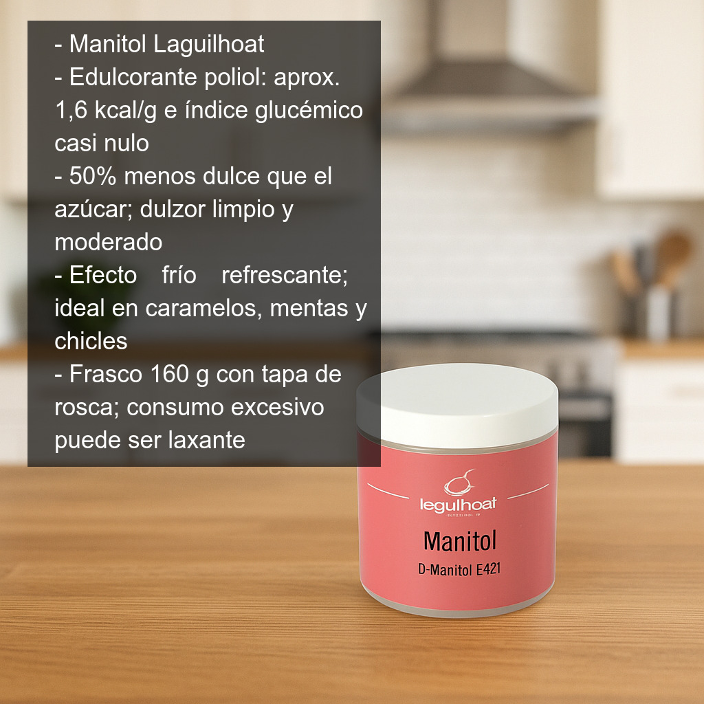 El manitol es un edulcorante perteneciente a la familia de los polioles, muy utilizado en repostería y confitería por su bajo aporte calórico (aprox. 1,6 kcal/g) y su índice glucémico prácticamente nulo. Es una alternativa interesante al azúcar para quienes buscan elaborar postres y dulces con menos impacto en la glucosa, manteniendo una textura agradable y un dulzor limpio.