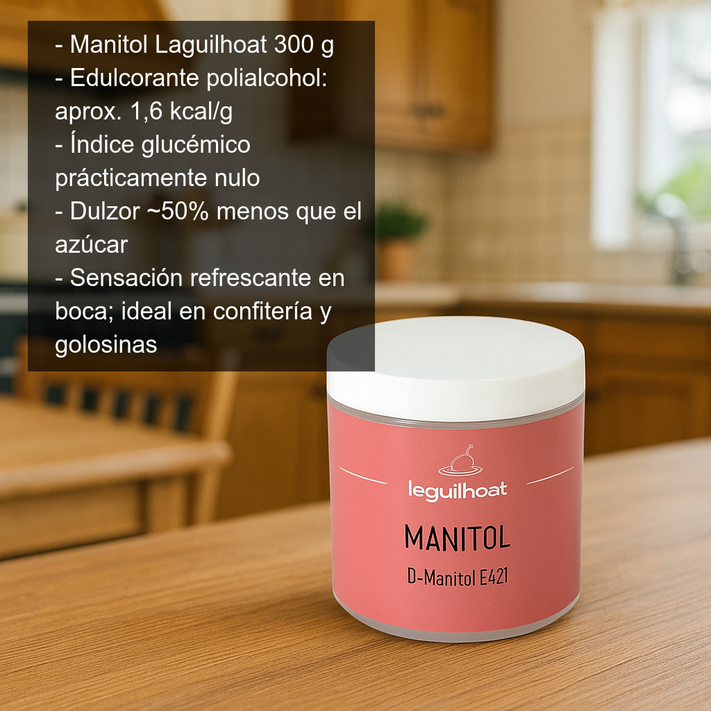 El manitol es un edulcorante de bajo contenido calórico (aprox. 1,6 kcal por gramo) y con un índice glucémico prácticamente nulo, por lo que es una alternativa interesante al azúcar en muchas elaboraciones. Su poder edulcorante es aproximadamente un 50% inferior al del azúcar, lo que permite ajustar el dulzor con mayor precisión en recetas donde se busca un resultado más equilibrado.