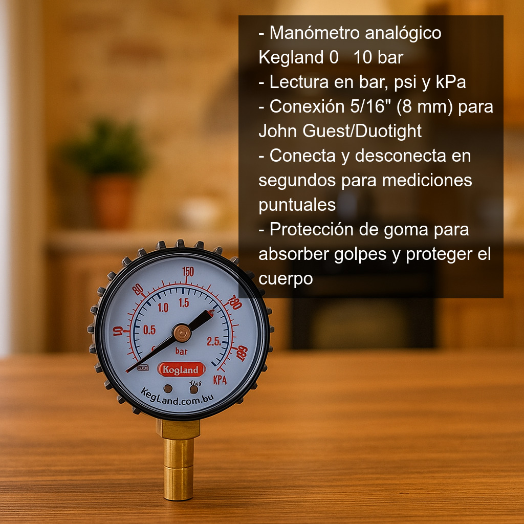 Se conecta mediante tubo de cobre de 5/16" (8 mm), compatible con racores de ajuste rápido tipo John Guest o Duotight de ese mismo diámetro. Gracias a este sistema, puedes conectarlo y desconectarlo en segundos, perfecto para realizar mediciones puntuales en distintos barriles o recipientes sin necesidad de dejar un manómetro fijo instalado.