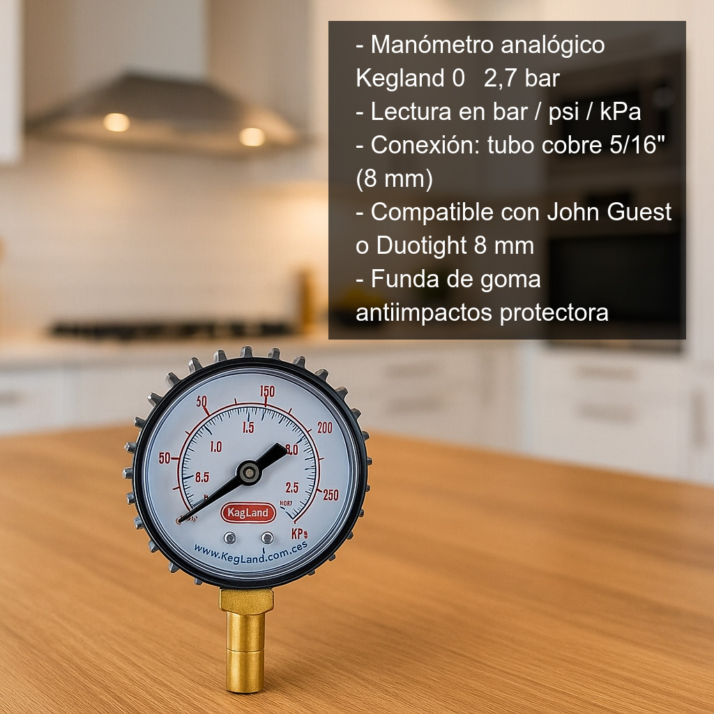 Manómetro analógico de aguja para medir presiones de forma rápida y fiable hasta 2,7 bar. Es un accesorio muy práctico para controlar la presión en barriles, fermentadores y otros recipientes presurizables, tanto en uso puntual como integrado en un sistema de regulación.