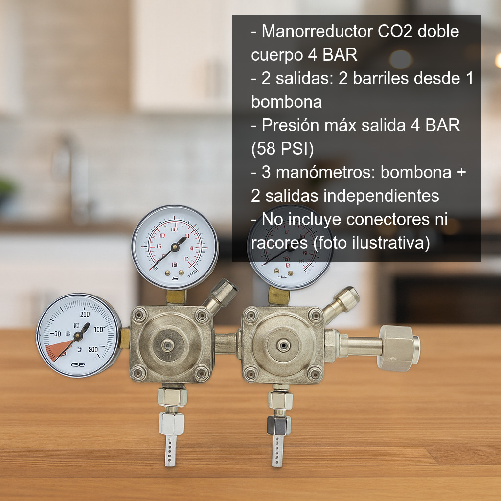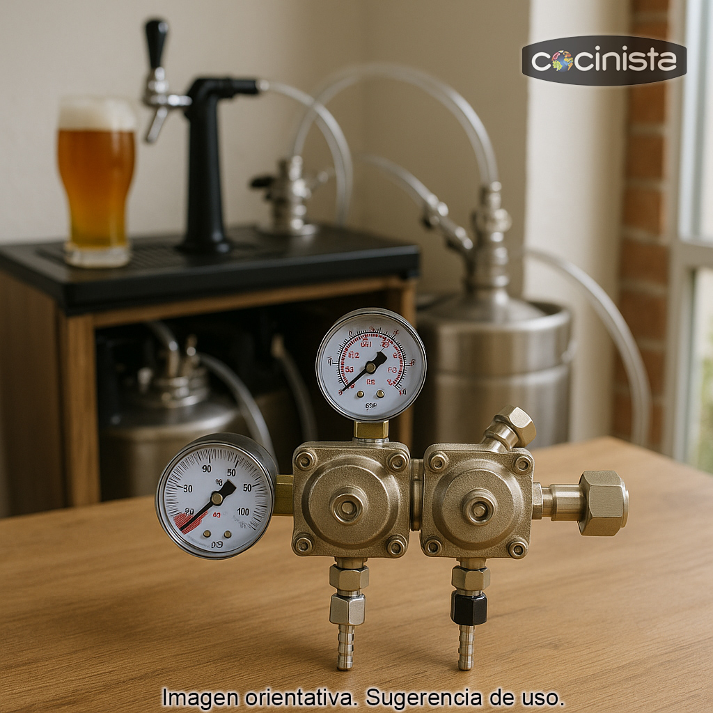 - Doble cuerpo / doble salida: permite alimentar dos barriles desde una misma bombona de CO2.