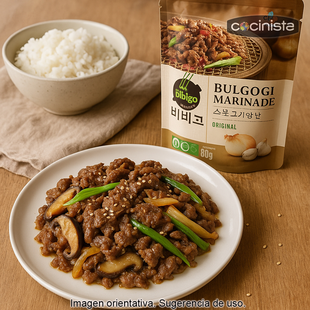El bulgogi es uno de los platos más populares de la gastronomía de Corea, conocido por su carne marinada (habitualmente ternera) que se cocina a la plancha, a la parrilla o en sartén. Con este marinado conseguirás ese característico equilibrio entre notas dulces y umami, ideal para recetas rápidas y llenas de sabor.