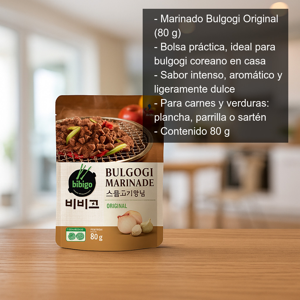 Marinado Bulgogi Original (80 g) en práctico formato bolsa, ideal para preparar en casa el auténtico bulgogi coreano: un adobo tradicional con un sabor intenso, aromático y ligeramente dulce, perfecto para realzar carnes y verduras con un acabado tipo parrilla o salteado.