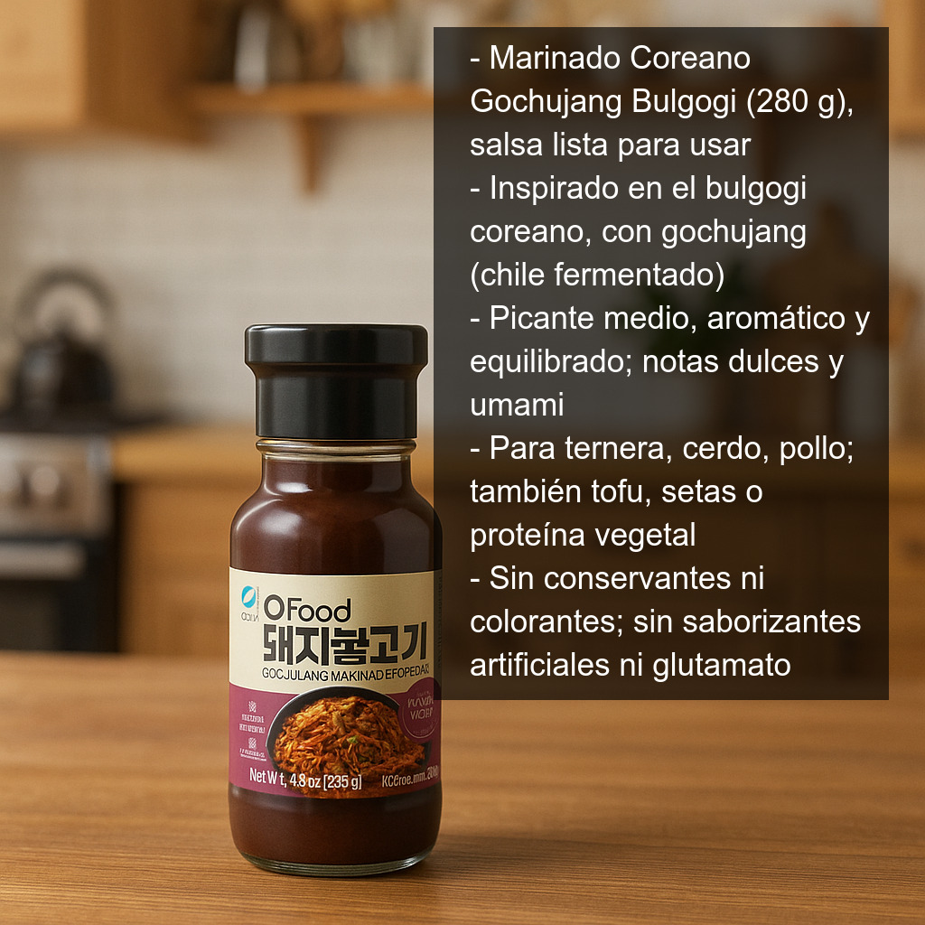 Ideal para quienes quieren preparar en casa auténticas recetas de barbacoa coreana o platos salteados al estilo asiático, este marinado aporta notas ligeramente dulces, umami y un toque especiado característico. Es perfecto para conseguir una carne jugosa, sabrosa y con ese acabado brillante típico del bulgogi.