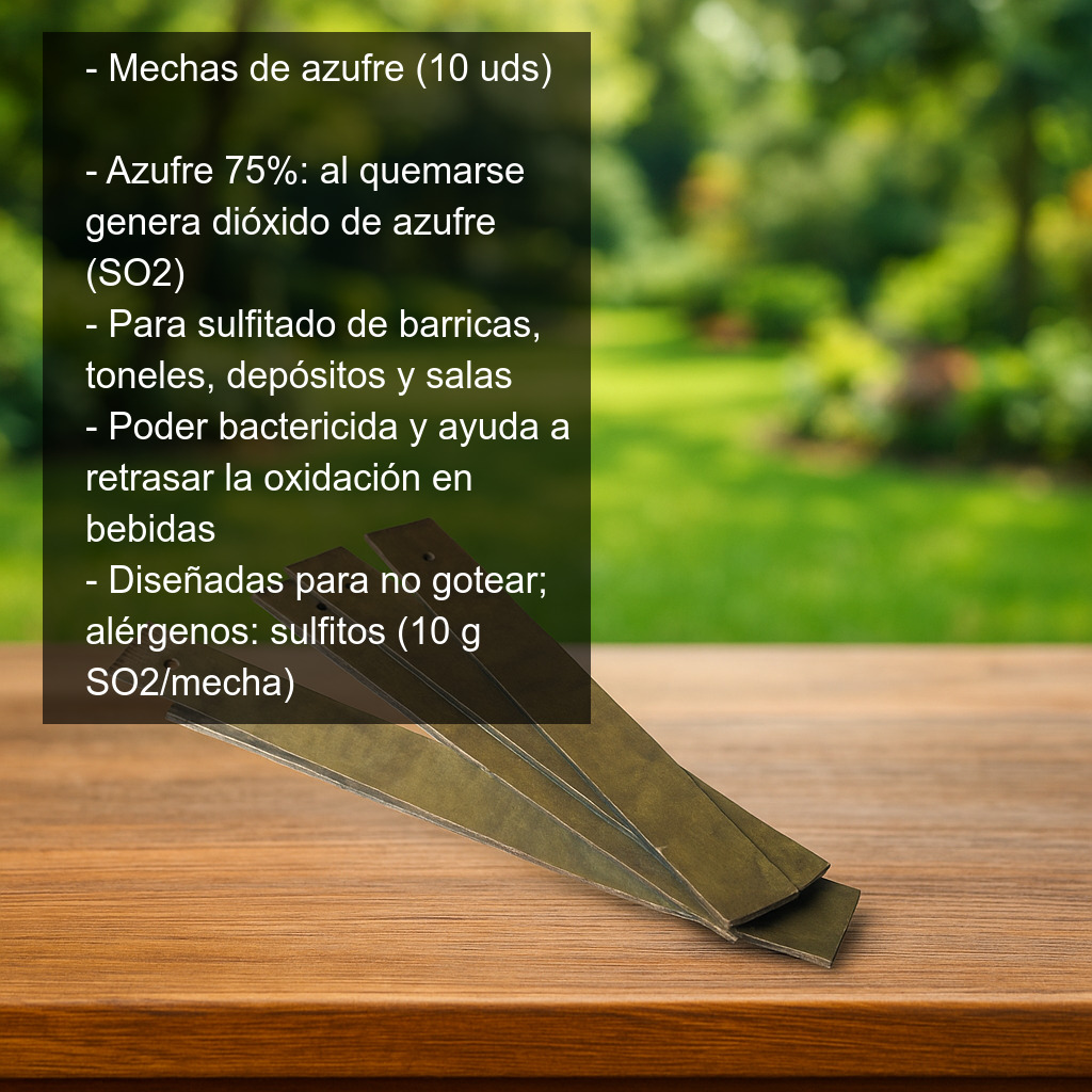 Las mechas de azufre son una solución clásica y muy eficaz para la desinfección y conservación de recipientes y espacios utilizados en elaboración y almacenamiento de bebidas. Al quemarse, generan dióxido de azufre (SO2), un gas con gran poder bactericida y con capacidad para retrasar la oxidación, ayudando a proteger el vino, la cerveza u otras bebidas frente a contaminaciones y aromas indeseados.