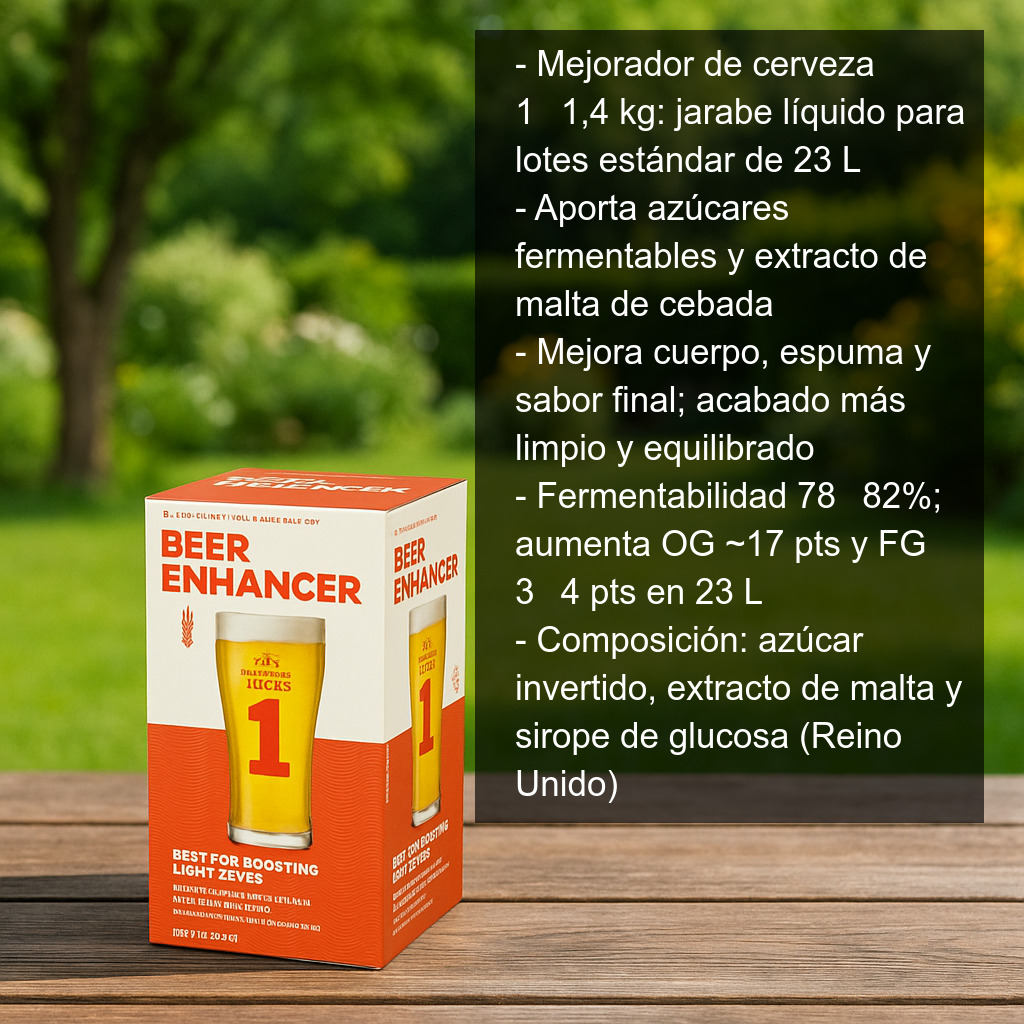 El mejorador de cerveza 1–1,4 kg es un jarabe concentrado especialmente pensado para mejorar cervezas elaboradas con kits y para reforzar recetas de homebrewing en lotes estándar de 23 litros. Se trata de un mejorador en formato líquido que aporta azúcares fermentables y extracto de malta, ayudando a conseguir una cerveza más equilibrada, con mejor textura y un acabado más limpio.