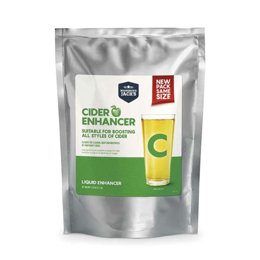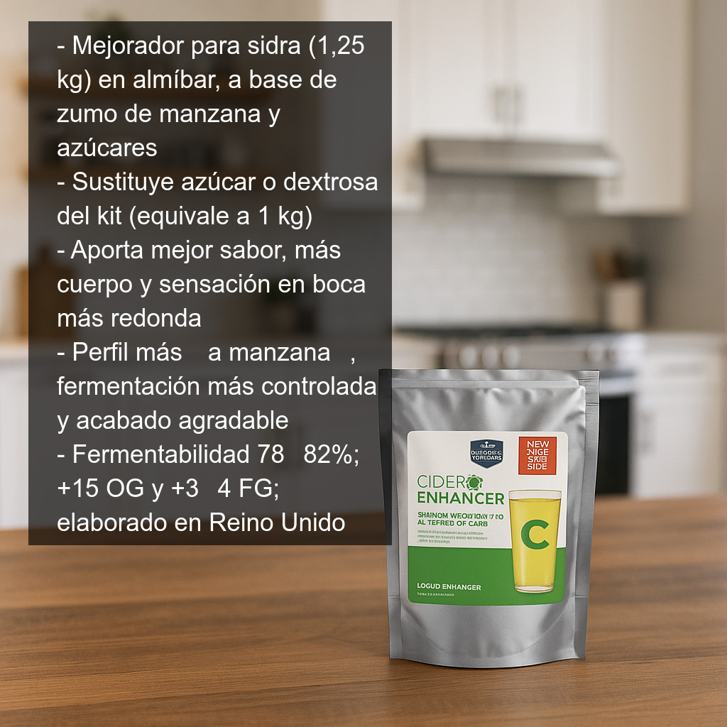 El mejorador para sidra (1,25 kg) es una mezcla en forma de almíbar elaborada a partir de zumo de manzana, azúcares seleccionados y otros ingredientes, especialmente formulada para mejorar la sidra elaborada a partir de un kit de sidra. Sustituye al azúcar o a la dextrosa habituales, aportando un perfil más equilibrado, con mejor sabor, más cuerpo y una sensación en boca más redonda.