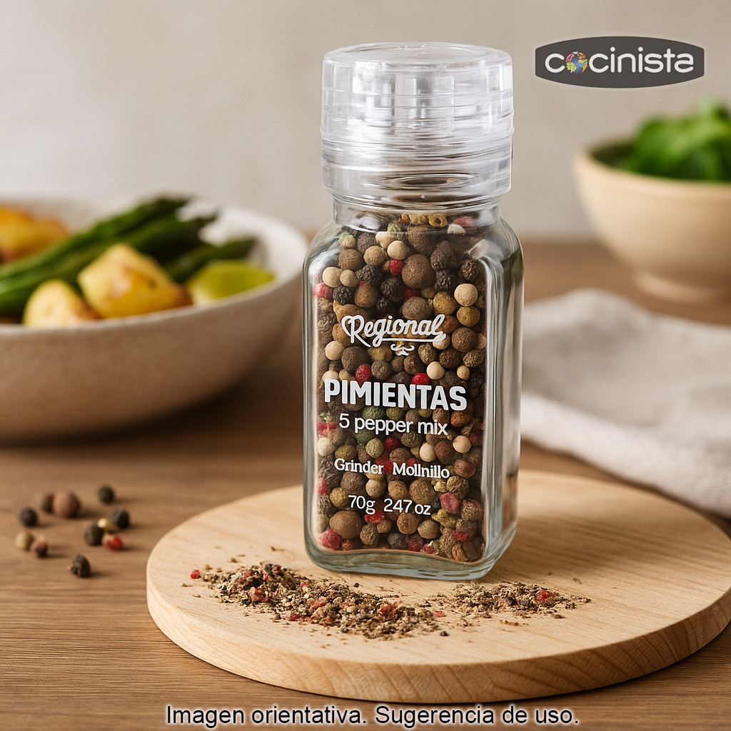 Descubre una mezcla de cinco pimientas pensada para quienes buscan dar un toque aromático y elegante a cualquier plato. Este molinillo con 70 g contiene pimientas enteras cuidadosamente combinadas para ofrecer un equilibrio perfecto entre intensidad, frescura y matices especiados.