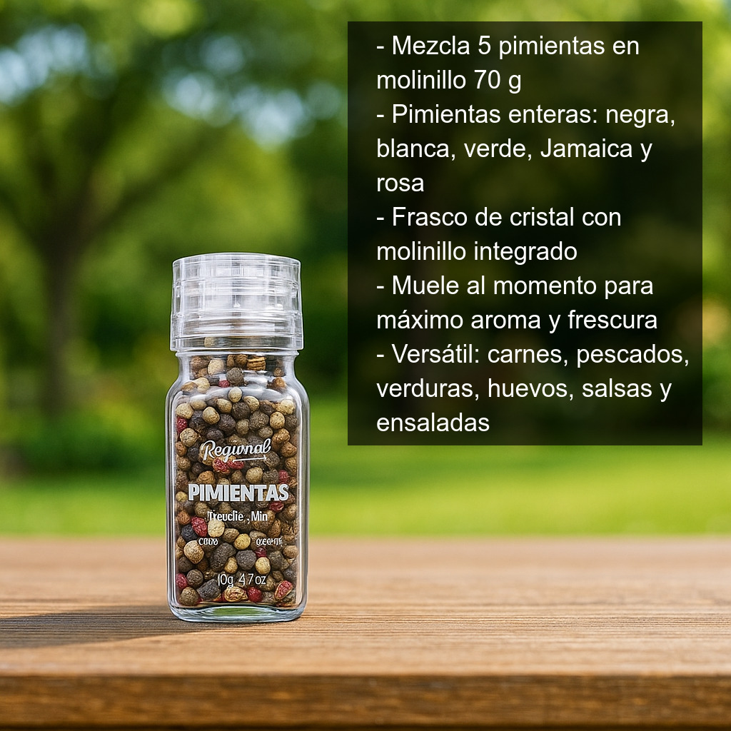 - Contenido: 70 g de mezcla de cinco pimientas enteras.