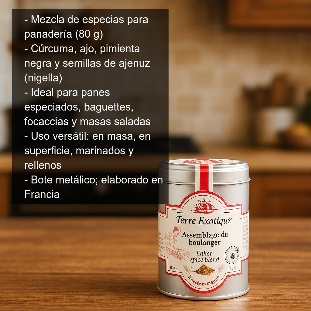 Mezcla de especias para panadería (80 g) pensada para dar un giro aromático a tus elaboraciones de pan casero. Esta combinación de cúrcuma, ajo, pimienta negra y semillas de ajenuz (nigella) es ideal para preparar panes especiados, baguettes y masas con personalidad. Aporta notas cálidas y terrosas de la cúrcuma que, al hornearse, se equilibran con el toque ligeramente picante de la pimienta y el matiz tostado, tipo nuez, característico de la nigella.