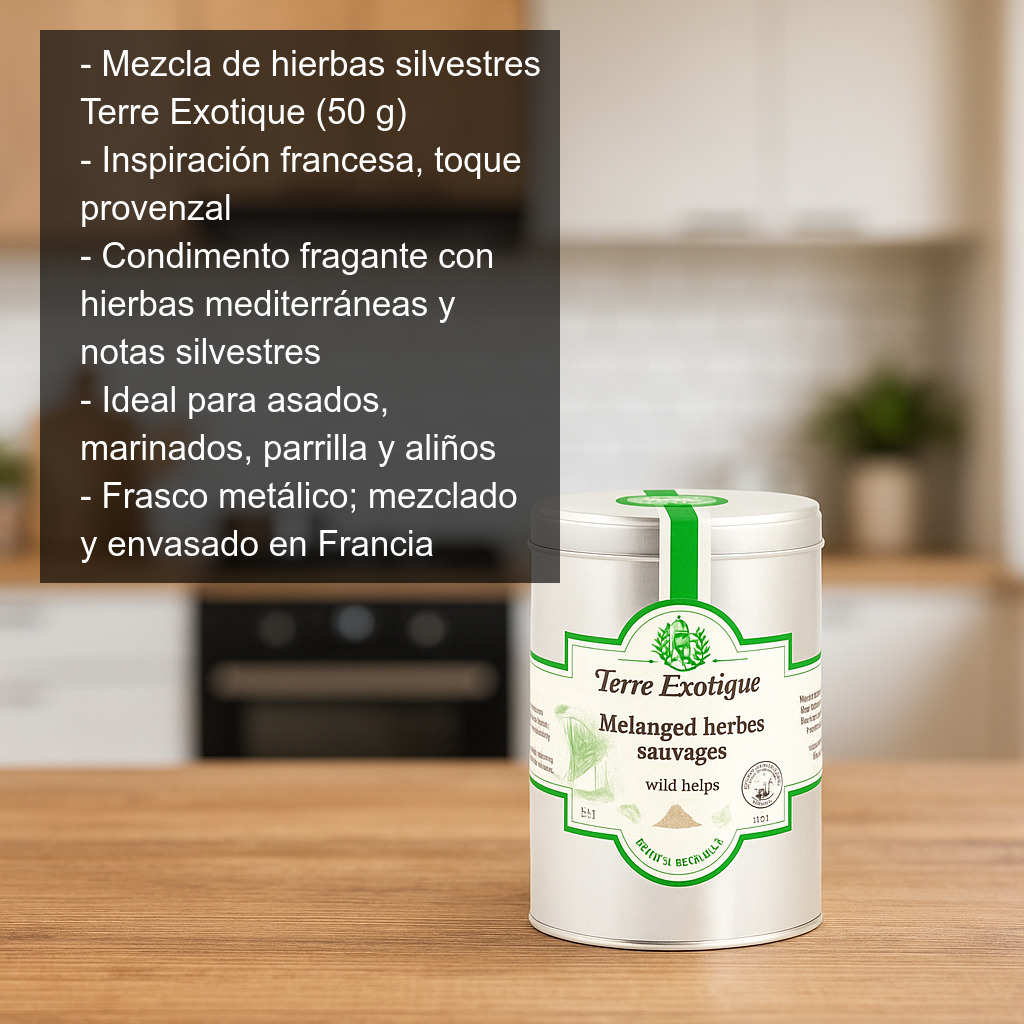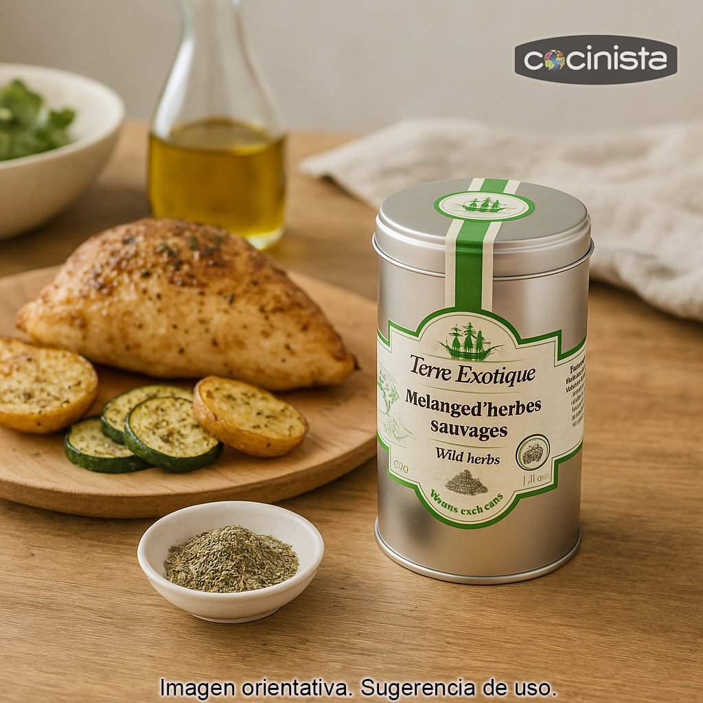 La Mezcla de hierbas silvestres (50 g) de Terre Exotique es una combinación aromática de clara inspiración francesa, elaborada con una selección cuidadosamente equilibrada de hierbas mediterráneas y notas silvestres. El resultado es un condimento fragante, lleno de matices, ideal para realzar recetas cotidianas y platos especiales con un toque provenzal.