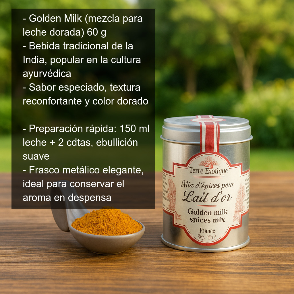 Se presenta en un elegante frasco metálico con 60 g de mezcla para preparar leche dorada, ideal para conservar el aroma y tenerla siempre a mano en la despensa.