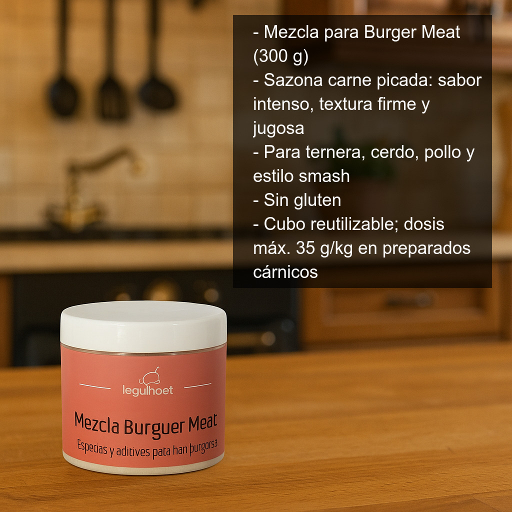 La Mezcla para Burger Meat (300 g) es un preparado de especias y aditivos especialmente formulado para sazonar carne picada y conseguir hamburguesas caseras con un sabor más intenso, una textura más firme y jugosa y un color apetecible. Ideal tanto para hamburguesas de ternera como para mezclas de cerdo, pollo o elaboraciones tipo smash, esta mezcla ayuda a que la carne quede bien ligada y con un resultado más uniforme en cada cocinado.