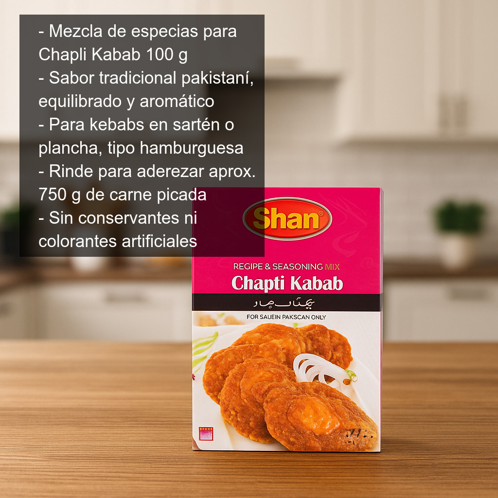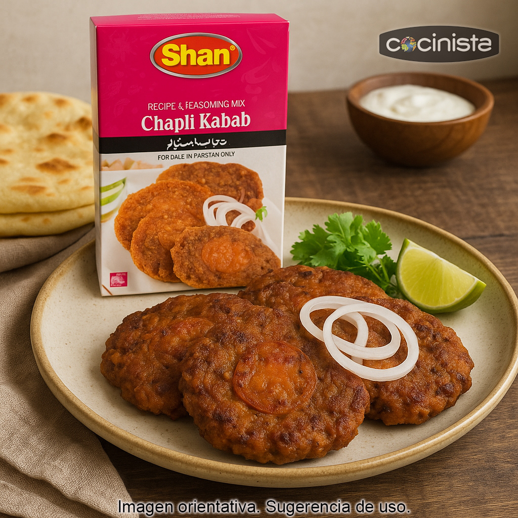 Cómo usarla (orientativo): mezcla la carne con la cantidad recomendada de especias, deja reposar unos minutos para que se integren los aromas, forma los chapli kabab y fríe hasta que estén bien dorados. Puedes acompañarlos con pan tipo naan, ensalada, yogur o salsas picantes.