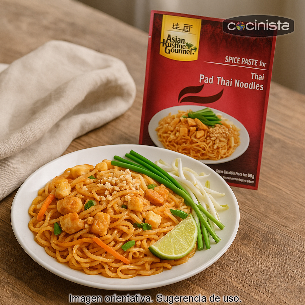 Se trata de una pasta sazonadora lista para usar, ideal para saltear junto con los ingredientes del Pad Thai. Al integrarse con los fideos de arroz y el resto de componentes, ayuda a conseguir ese sabor “street food” tan reconocible del Pad Thai, uno de los platos más populares de la gastronomía tailandesa.