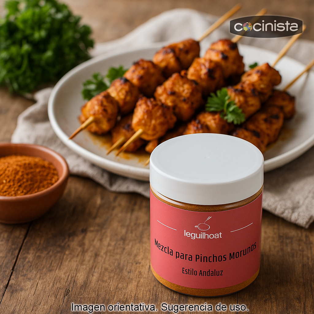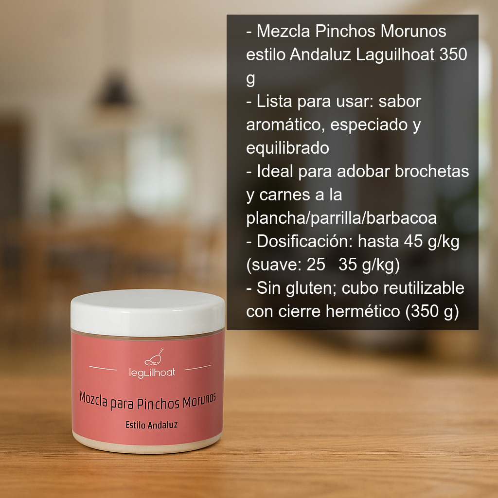 Prepara en casa unos auténticos pinchos morunos estilo andaluz con esta mezcla de especias lista para usar. La Mezcla para Pinchos Morunos estilo Andaluz Laguilhoat (350 g) está pensada para aportar ese sabor característico: aromático, especiado y equilibrado, ideal para brochetas y carnes a la plancha, parrilla o barbacoa.