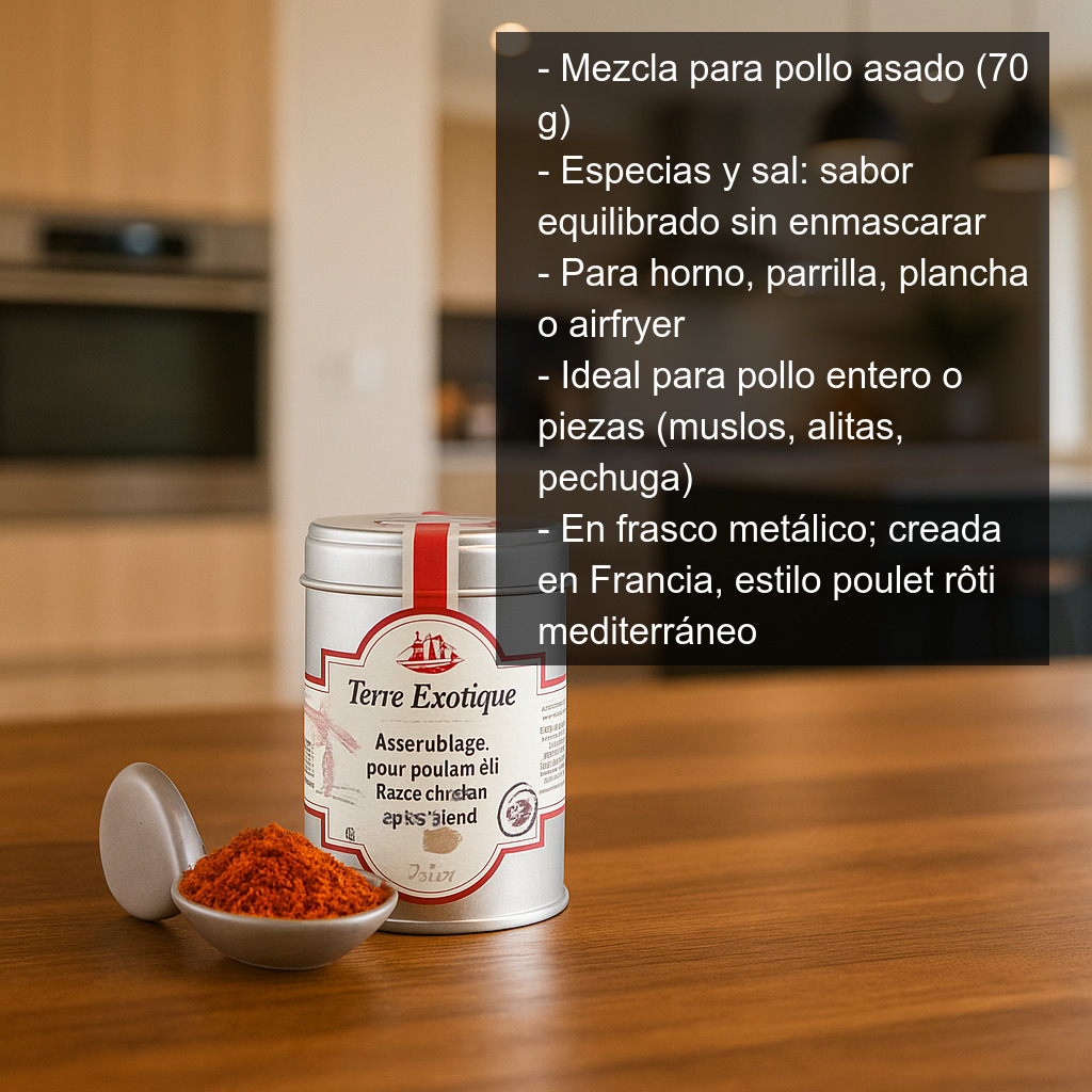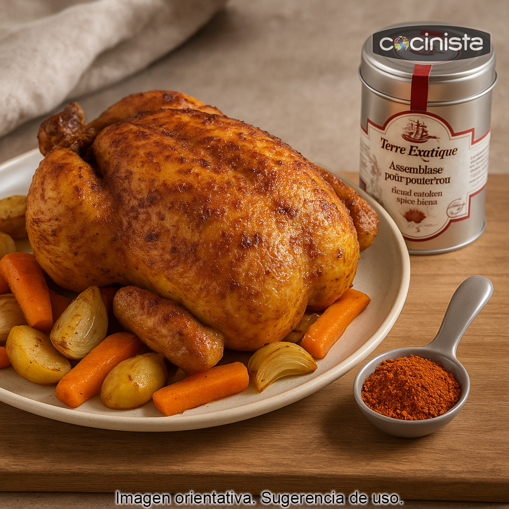 Consigue un pollo asado jugoso, aromático y con piel crujiente con esta mezcla para pollo asado (70 g), una combinación equilibrada de especias y sal pensada para realzar el sabor del ave sin enmascararlo. Es ideal tanto para un pollo entero al horno como para muslos, contramuslos, alitas o pechugas a la parrilla, a la plancha o en airfryer.