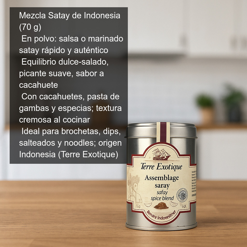 Mezcla Satay de Indonesia (70 g) en polvo para preparar de forma rápida y auténtica una salsa Satay o un marinado satay al estilo del sudeste asiático. Esta mezcla ofrece un equilibrio muy característico entre dulce y salado, con un picante suave y un sabor intenso donde predomina el cacahuete, ideal para dar un toque exótico a platos cotidianos.
