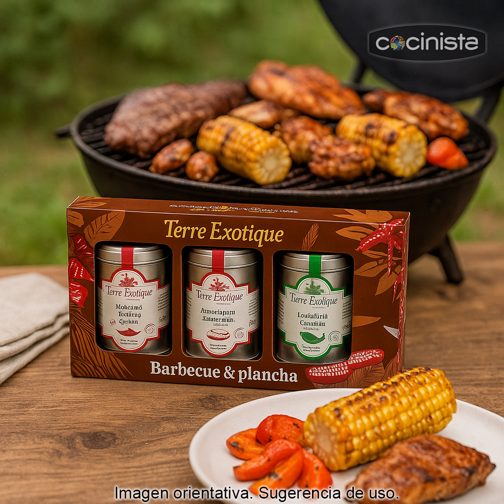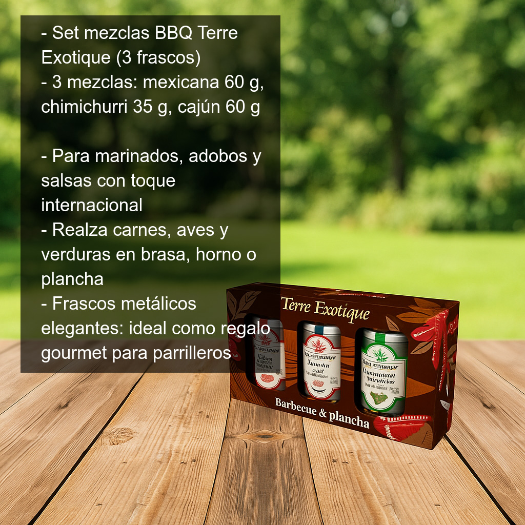 Convierte cualquier comida al aire libre en una auténtica fiesta barbacoa con este set de mezclas de especias Terre Exotique, pensado para preparar marinados, adobos y salsas llenas de sabor. Un pack ideal para quienes disfrutan de la parrilla, los asados y las recetas con un toque internacional, con tres mezclas inspiradas en grandes clásicos de la cocina mexicana, argentina y cajún.