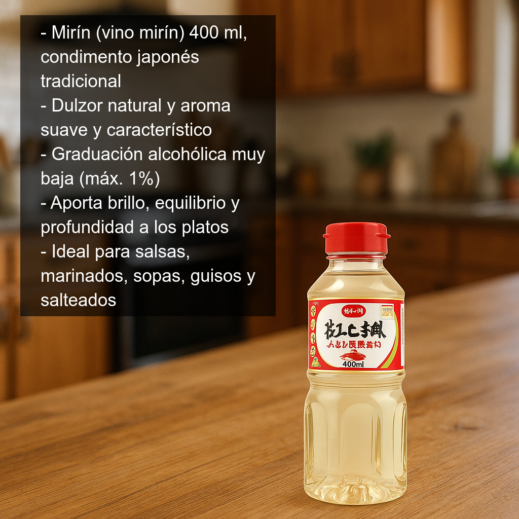 Mirín (vino mirín) 400 ml es un condimento tradicional de la cocina japonesa elaborado a partir de arroz, con un dulzor natural y un aroma suave y característico. Tiene una graduación alcohólica muy baja (máx. 1%) y se utiliza para aportar brillo, equilibrio y profundidad a una gran variedad de platos.