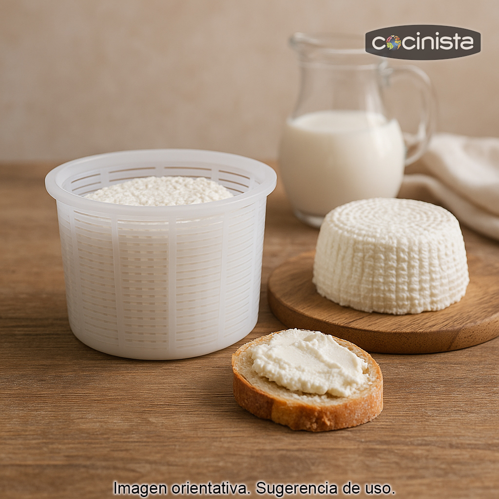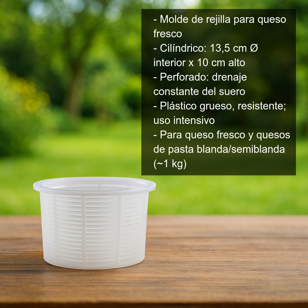 Su diseño tipo rejilla (perforado) favorece el drenaje del suero de manera constante, ayudando a que la cuajada se asiente correctamente y a obtener un queso más compacto y homogéneo. Es especialmente útil en elaboraciones de queso fresco, aunque también puede emplearse en otros quesos de pasta blanda o semiblanda en los que se requiera un buen desuerado.