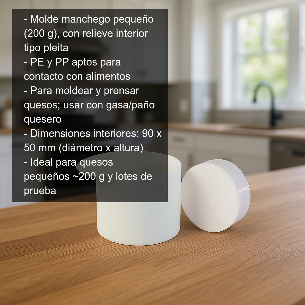 El molde manchego pequeño (200 g) es un molde para queso tipo manchego fabricado en polietileno (PE) y polipropileno (PP), materiales plásticos de alta calidad aptos para el contacto con alimentos. Está pensado para quienes elaboran queso casero y buscan un acabado tradicional y profesional en piezas pequeñas.