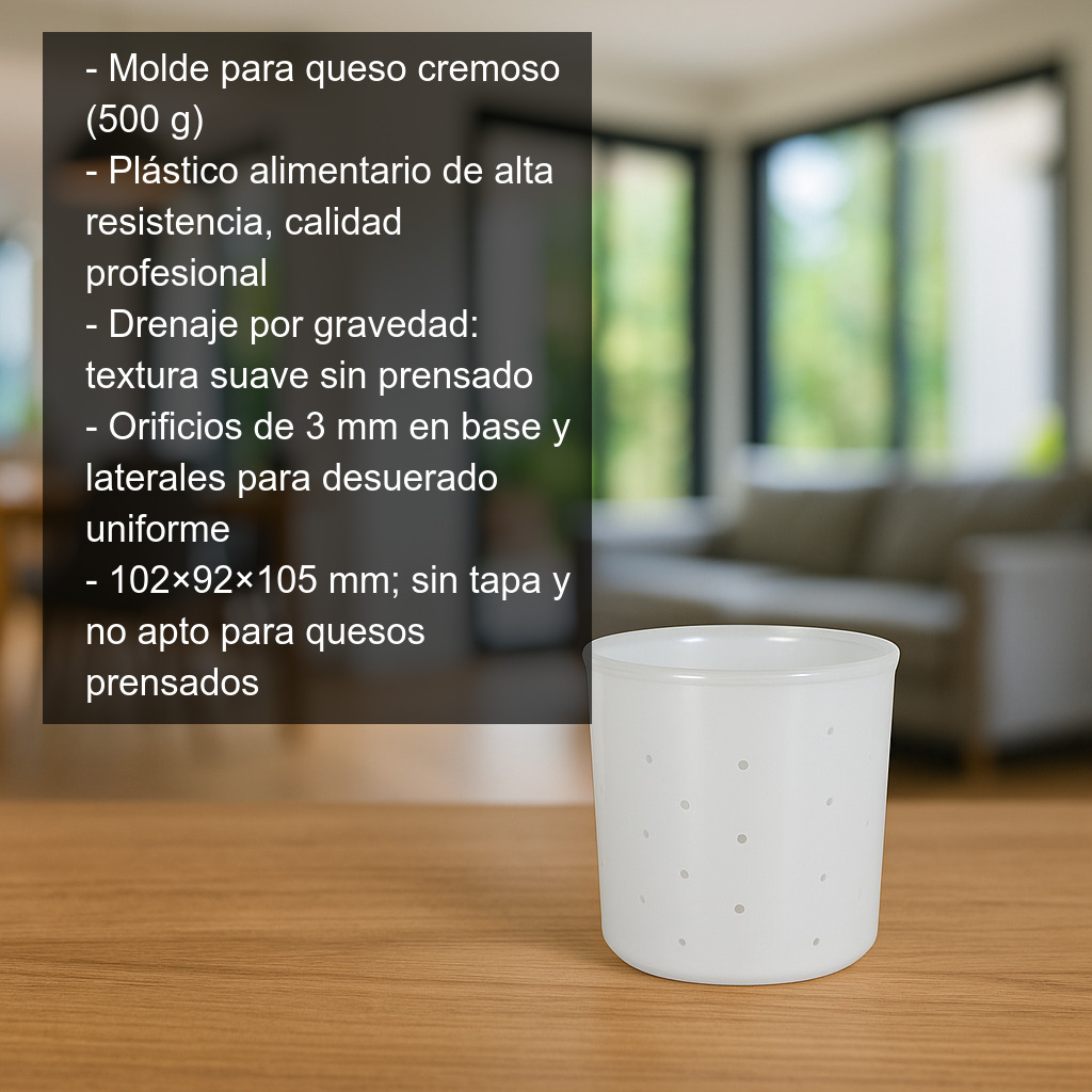 Molde para queso cremoso (500 g) fabricado en plástico alimentario de alta resistencia, ideal para la elaboración casera o profesional de quesos frescos, quesos cremosos y quesos untables (tipo queso crema, requesón/ricotta, queso de yogur, etc.). Su diseño está pensado para un desuerado natural por gravedad, ayudándote a conseguir una textura suave y homogénea sin necesidad de prensado.