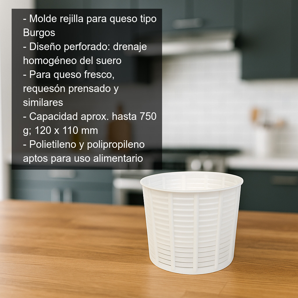 - Tipo: molde rejilla / perforado para queso fresco (tipo Burgos).