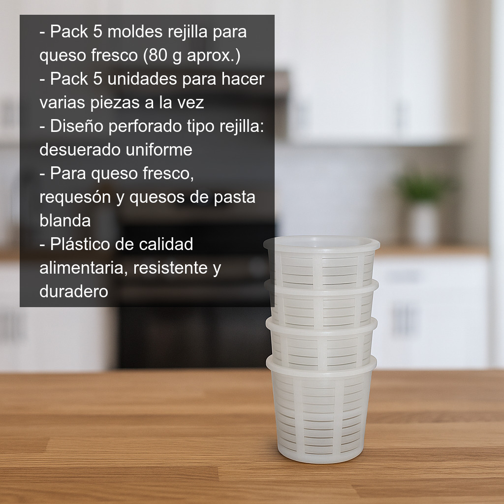 Pack de 5 unidades de moldes de rejilla para queso fresco, ideales para elaborar quesitos individuales o de ración de aproximadamente 80 g cada uno. Estos moldes pequeños son perfectos para preparar en casa queso fresco, requesón o quesos de pasta blanda, facilitando un desuerado uniforme gracias a su diseño perforado tipo rejilla.