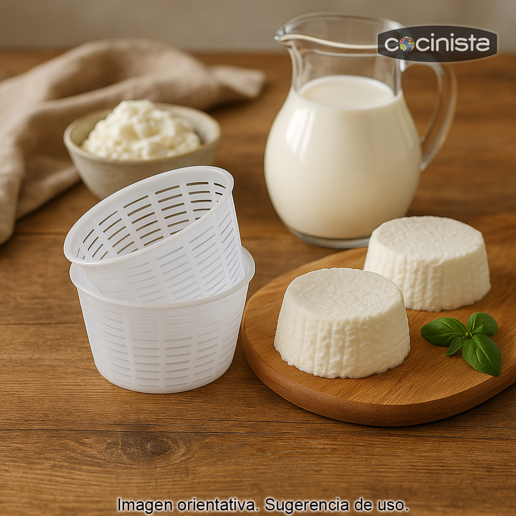 Con estas dimensiones, cada molde permite elaborar piezas de aproximadamente 200 a 250 g (según el tipo de leche, el punto de cuajado y el tiempo de escurrido). Son una opción práctica tanto si estás empezando en la elaboración de queso casero como si ya haces queso con frecuencia y quieres trabajar con varias unidades a la vez.