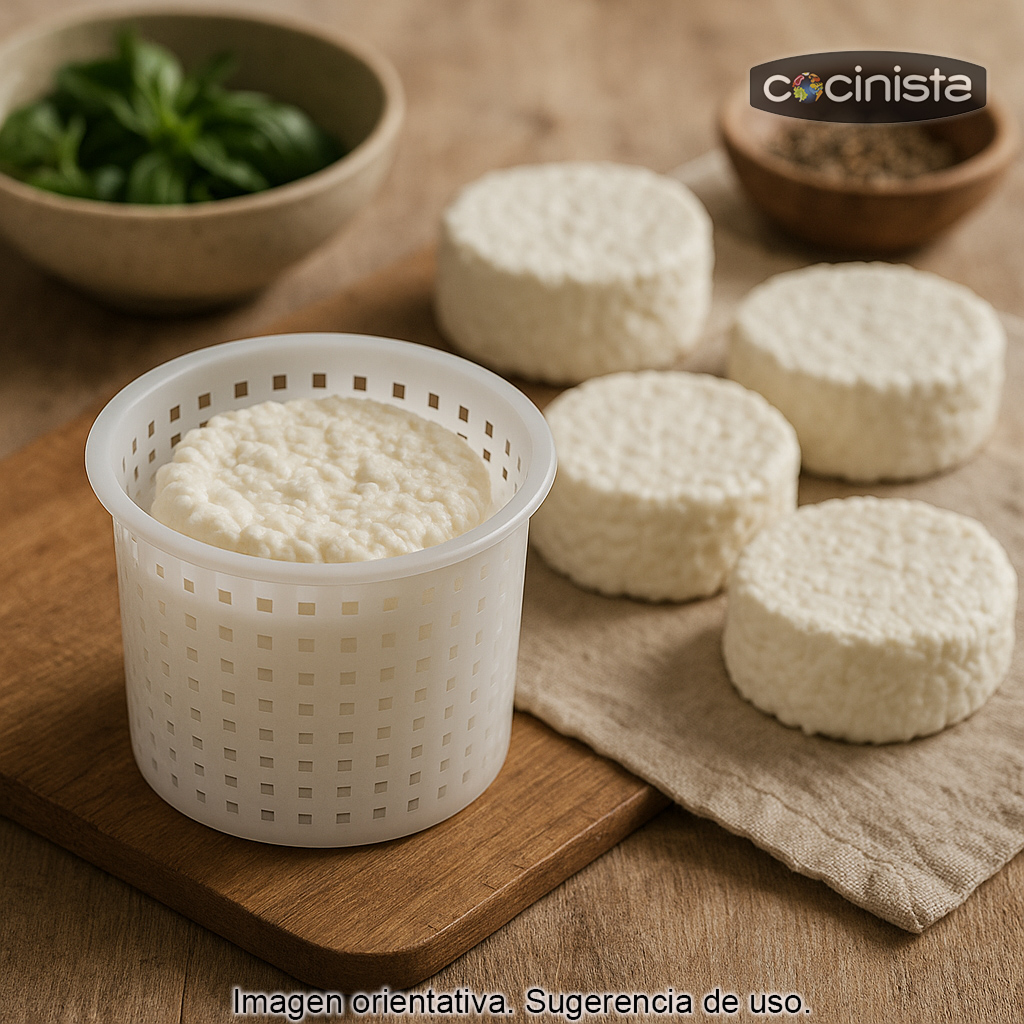 - Capacidad por molde: hasta 100 g de queso fresco (aprox., según receta y escurrido).