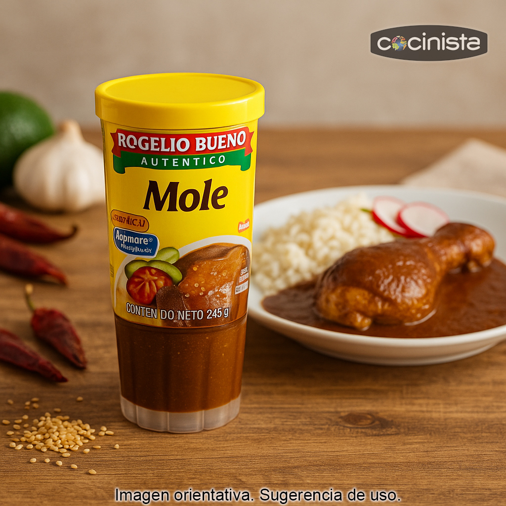 El mole rojo en pasta Rogelio Bueno (245 g) es una forma rápida y deliciosa de disfrutar en casa de una de las salsas más emblemáticas de la gastronomía mexicana. El mole es una preparación compleja y aromática elaborada tradicionalmente con una mezcla de chiles secos, especias, frutos secos, semillas, condimentos y, en muchas recetas, un toque de chocolate que aporta profundidad y equilibrio. Existen moles con más de 40 ingredientes, por lo que esta versión en pasta es ideal para conseguir un resultado auténtico sin largas elaboraciones.