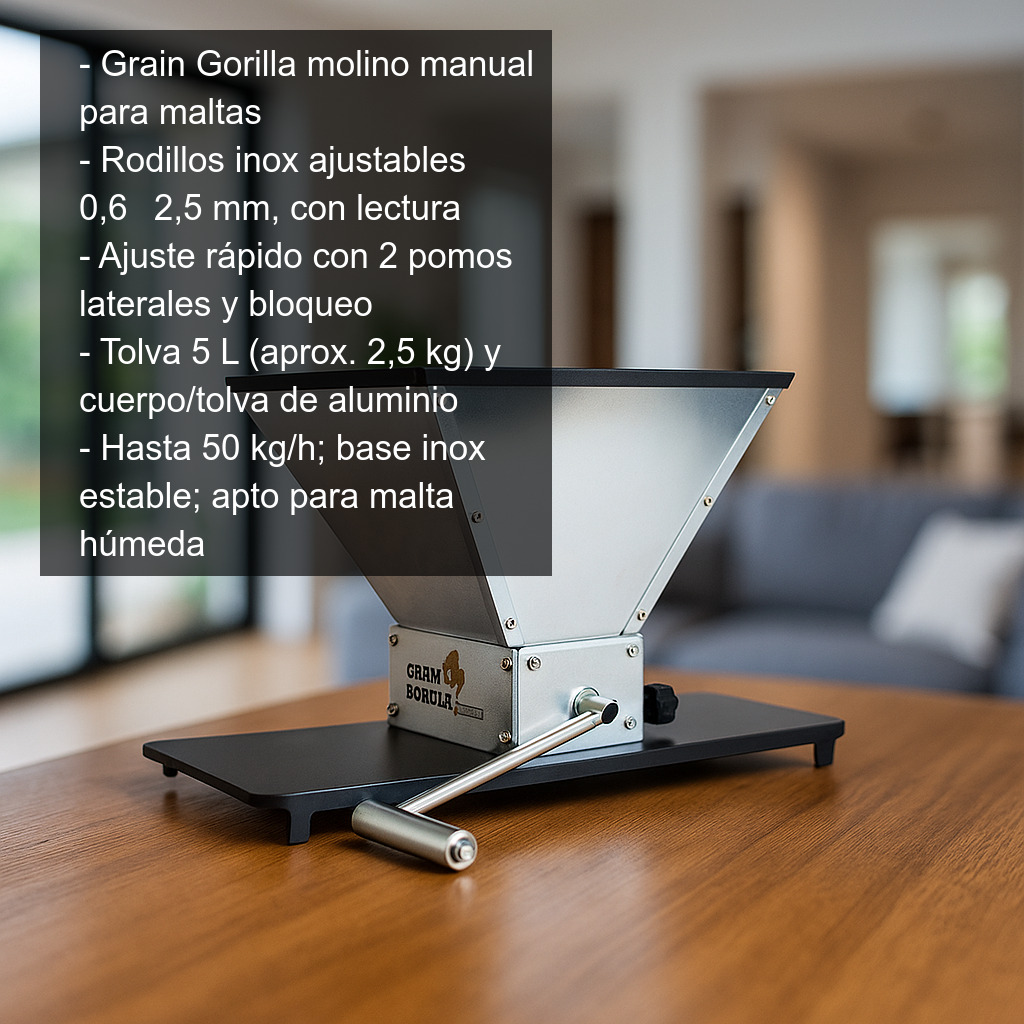El Grain Gorilla es el King Kong de los molinos manuales para maltas. Con rodillos ajustables fabricados en acero inoxidable, te permite ajustar el molturado de tu malta a tu gusto. El ajuste se hace en un momento gracias a dos pomos laterales. Una vez elegido el grosor deseado, se puede bloquear el ajuste.
