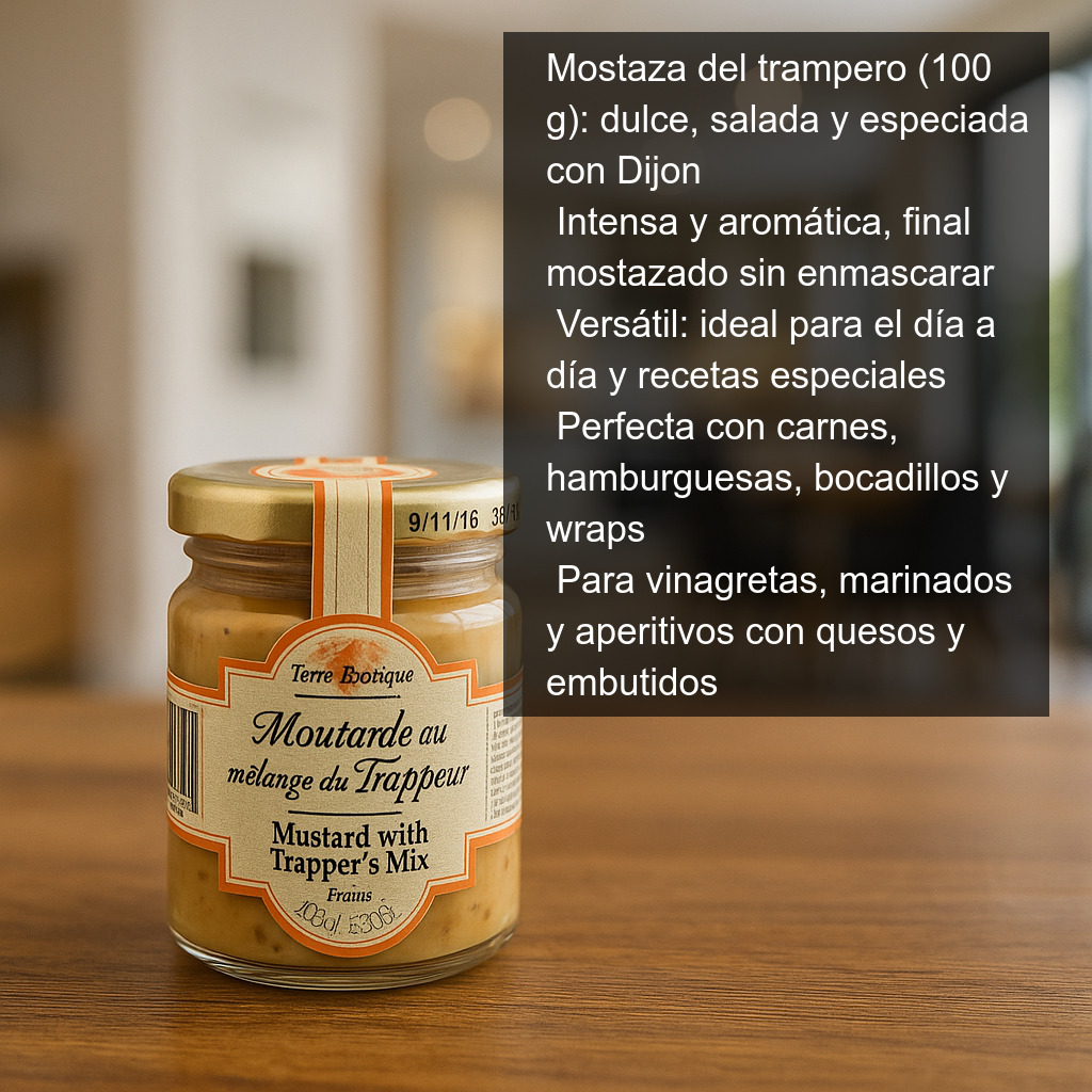 La Mostaza del trampero (100 g) es una salsa gourmet inspirada en la famosa “mezcla del trampero”, un clásico de Canadá nacido, según la leyenda, de un accidente afortunado: un trampero dejó caer azúcar sobre una mezcla de especias y sal y descubrió un equilibrio sorprendente entre dulce, salado y especiado. En esta versión, ese perfil tan característico se enriquece con el toque elegante y ligeramente picante de la mostaza de Dijon, dando como resultado una salsa intensa, aromática y muy versátil.