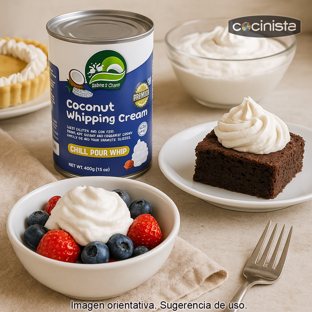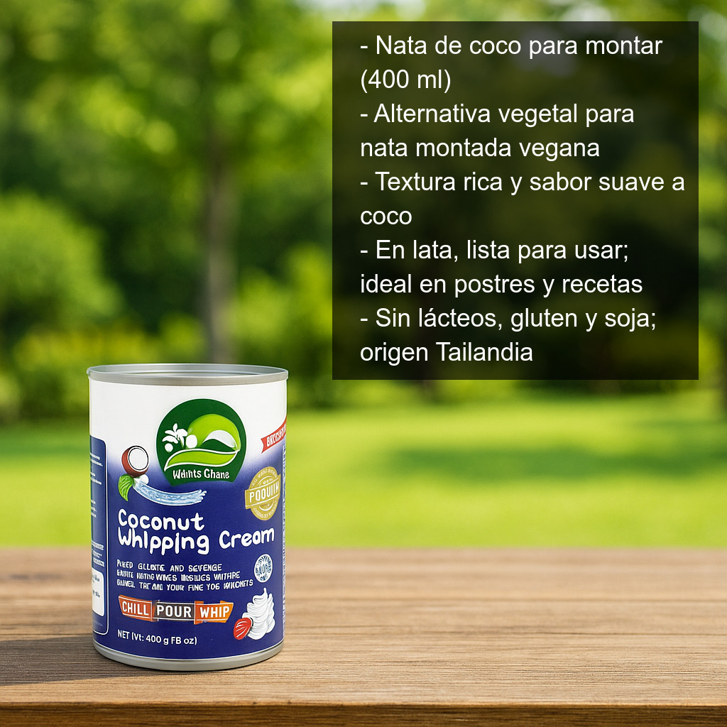 La "nata" de coco para montar (400 ml) es una alternativa vegetal perfecta para preparar nata montada vegana y elaborar postres cremosos sin utilizar nata de leche de vaca. Su textura rica y su sabor suave a coco la convierten en un ingrediente ideal para repostería, bebidas y recetas dulces o saladas, aportando cremosidad de forma natural.