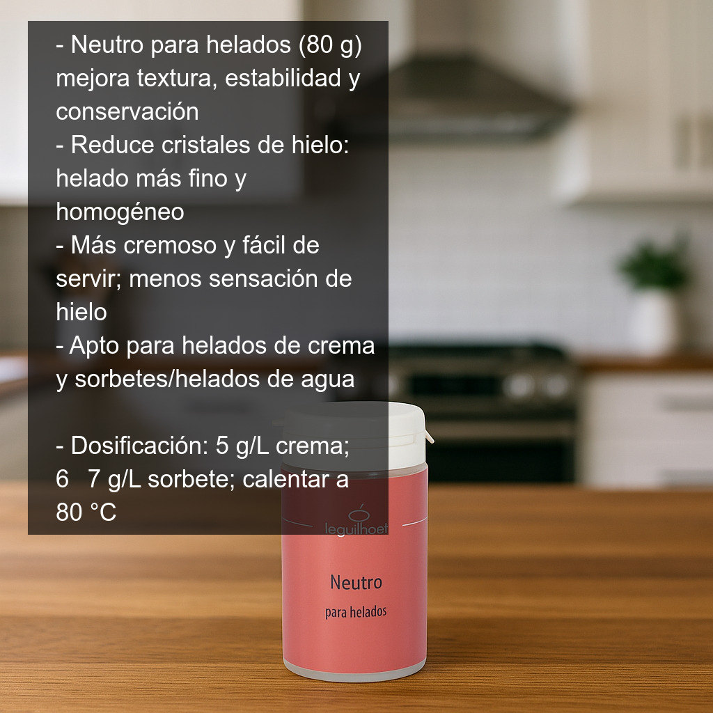 El neutro para helados es un ingrediente imprescindible para mejorar la textura, estabilidad y conservación de helados y sorbetes, tanto en elaboraciones caseras como profesionales. Esta mezcla de estabilizantes y emulsionantes ayuda a conseguir un helado más cremoso, untuoso y fácil de servir, reduciendo la sensación de hielo y mejorando el resultado final incluso en recetas con menos grasa o azúcar.