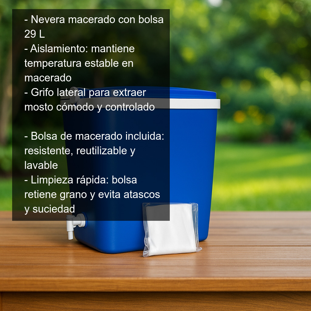 - Uso: sistema de macerado de malta con bolsa (macerador/nevera aislada).