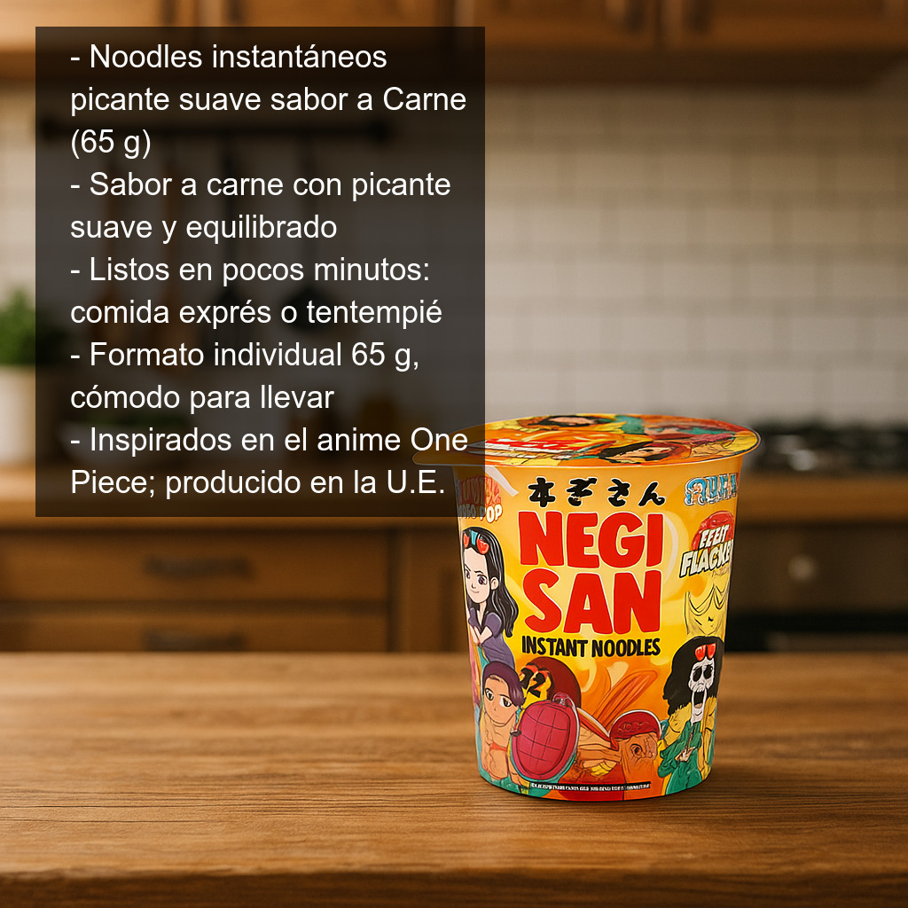 Noodles instantáneos picante suave sabor a Carne (65 g) con un toque especiado equilibrado, ideales para quienes buscan un ramen rápido y sabroso sin un picante excesivo. Inspirados en el universo del famoso anime One Piece, son una opción perfecta para una comida exprés, una cena ligera o un tentempié entre episodios.
