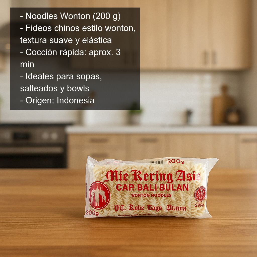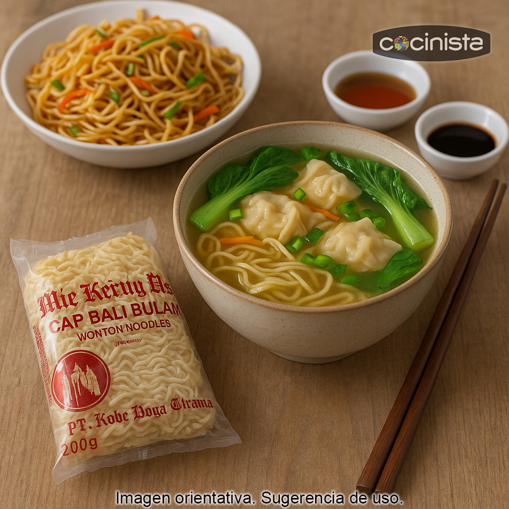 Los Noodles Wonton (200 g) son fideos chinos estilo wonton, ideales para preparar en casa recetas asiáticas rápidas y llenas de sabor. Su textura suave y elástica los convierte en una base perfecta para platos tradicionales como la sopa de wonton, noodles salteados tipo chow mein o bowls con verduras, carne, pollo, gambas o tofu. Son deliciosos y muy fáciles de preparar, perfectos tanto para el día a día como para cenas especiales.