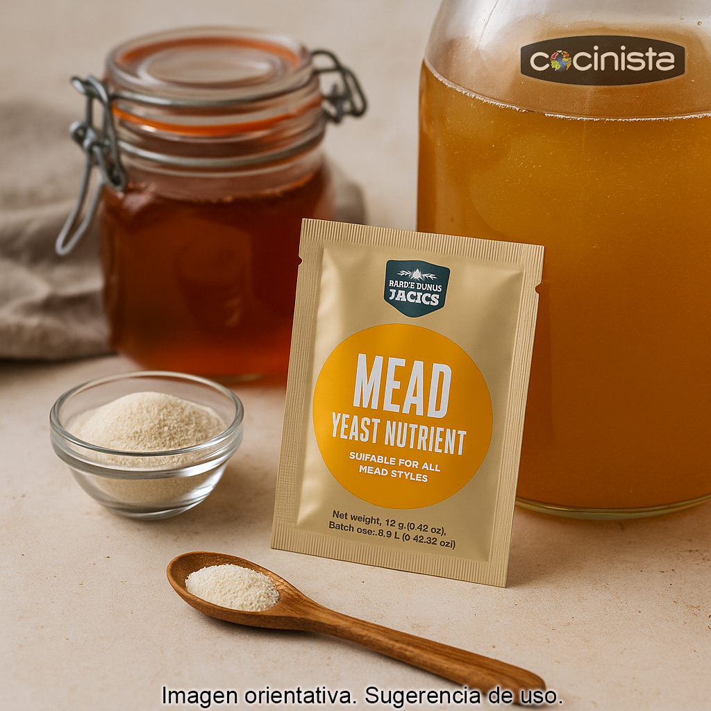 El orden de incorporación es importante: añade los nutrientes para levadura siempre al hidromiel antes de añadir la levadura. De este modo, cuando inocules la levadura, encontrará desde el inicio un medio más equilibrado y favorable para arrancar la fermentación con fuerza.