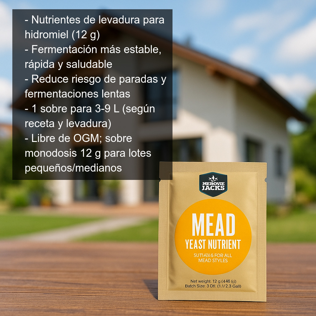 Nutrientes de levadura para hidromiel (12 g) formulados para favorecer una fermentación más estable, rápida y saludable en la elaboración de hidromiel casera. Este aporte nutricional ayuda a que la levadura trabaje en condiciones óptimas, reduciendo el riesgo de paradas de fermentación y mejorando la calidad del resultado final.